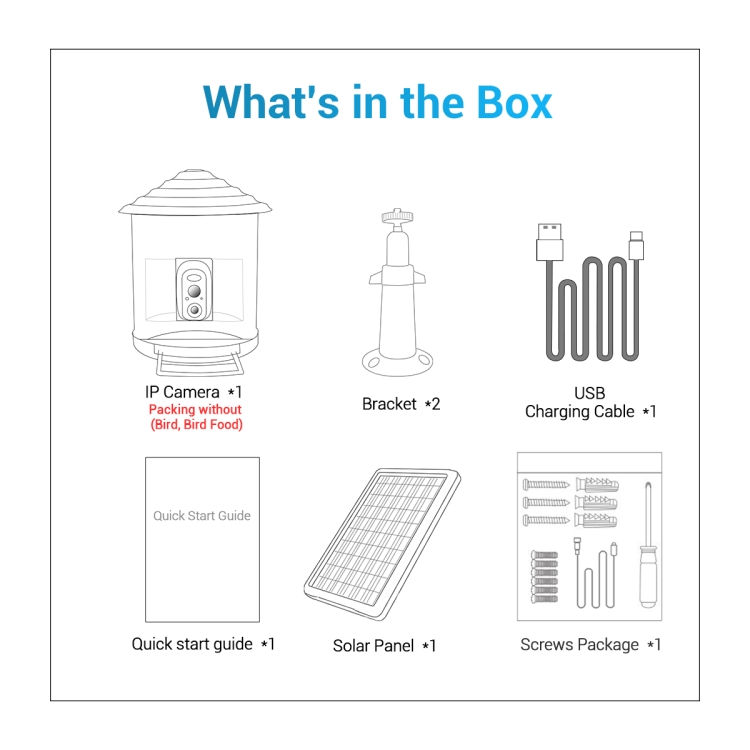 Accessories: WiFi camera x1, solar panel x1, screw pack x1, USB charging cable x1, manual x1, bracket x1, bird watching house x1