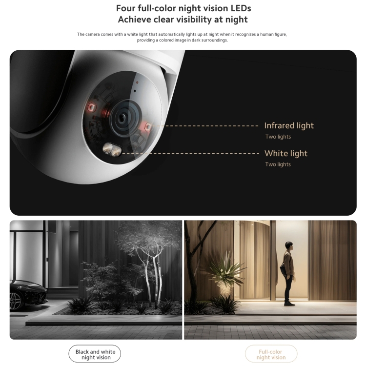 2. Four-light full-color night vision, the picture still maintains color in low-light environments, and the fill light automatically turns on after recognizing human figures at night.
